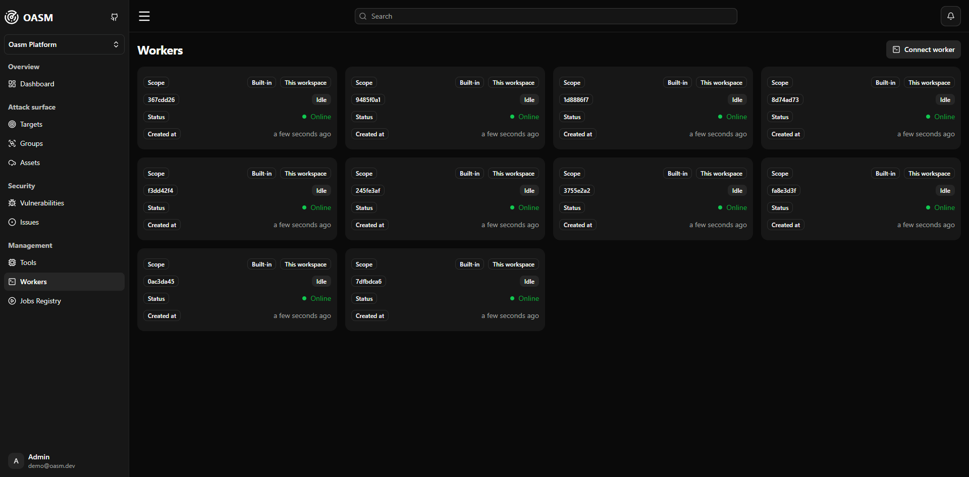Workers are designed to scale horizontally without limitation. You can run multiple worker instances in parallel to increase processing capacity. This allows the system to handle large-scale scanning workloads efficiently. As demand grows, additional workers can be deployed to distribute the load and reduce execution time.Worker Scope